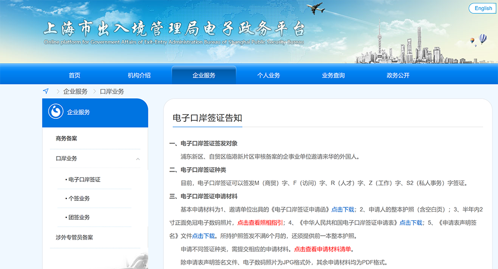 据了解,电子口岸签证全程网上办理。经审核备案的企业单位,可登录上海市公安局出入境管理局电子政务平台,代申请人提交签证申请信息。待电子口岸签证签发后,邀请单位可登录电子政务平台代为下载《中华人民共和国电子口岸签证确认书》PDF电子文件并发送至申请人。申请人可将《确认书》下载保存在电子设备或自行打印,凭护照及电子签证入境、停留。