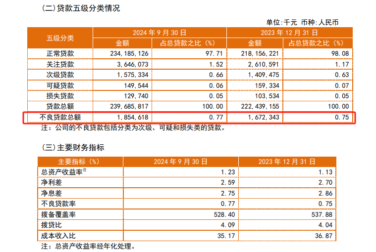 截至三季度末,常熟银行不良贷款“双升”,不良贷款总额18.55亿元,较上年末增长1.82亿元;不良贷款率0.77%,较上年末上升0.02个百分点;拨备覆盖率528.4%,较上年末下降9.48个百分点;拨贷比4.09%,较上年末上升0.05个百分点。