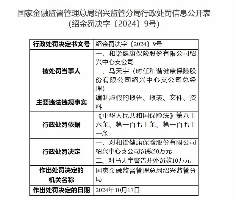 此外,时任和谐健康保险股份有限公司绍兴中心支公司总经理马天宇,被罚款10万元。