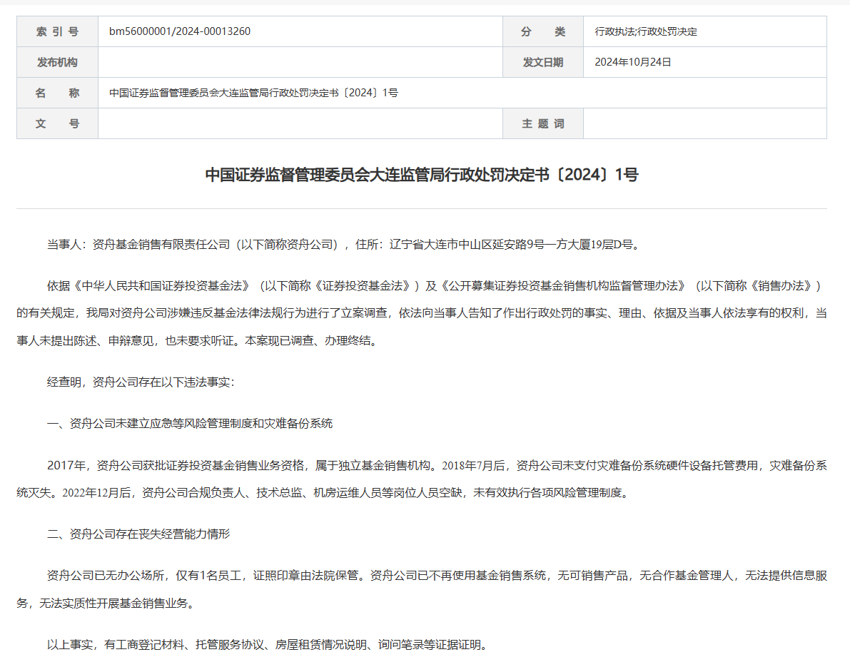 据中国证券监督管理委员会大连监管局行政处罚决定书披露,资舟基金销售有限责任公司因涉嫌违反基金法律法规行为,被大连监管局进行了立案调查,依法向当事人告知了作出行政处罚的事实、理由、依据及当事人依法享有的权利,当事人未提出陈述、申辩意见,也未要求听证。本案现已调查、办理终结。