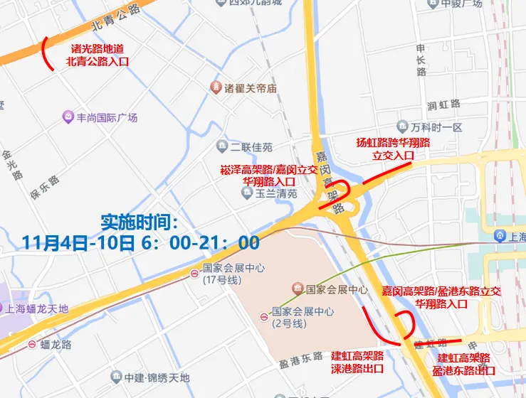 以及嘉闵高架路/盈港东路立交华翔路入口、建虹高架路盈港东路出口、建虹高架路涞港路出口、扬虹路跨华翔路立交入口、崧泽高架路/嘉闵立交华翔路入口以及诸光路地道北青公路入口,除下列车辆外,禁止其他机动车通行:执行公务的警车、消防车、救护车、工程抢险车;公交运营线路车辆;出租车;持有公安机关核发的各类进博会车辆证件和《控制区预约停车证》的车辆。