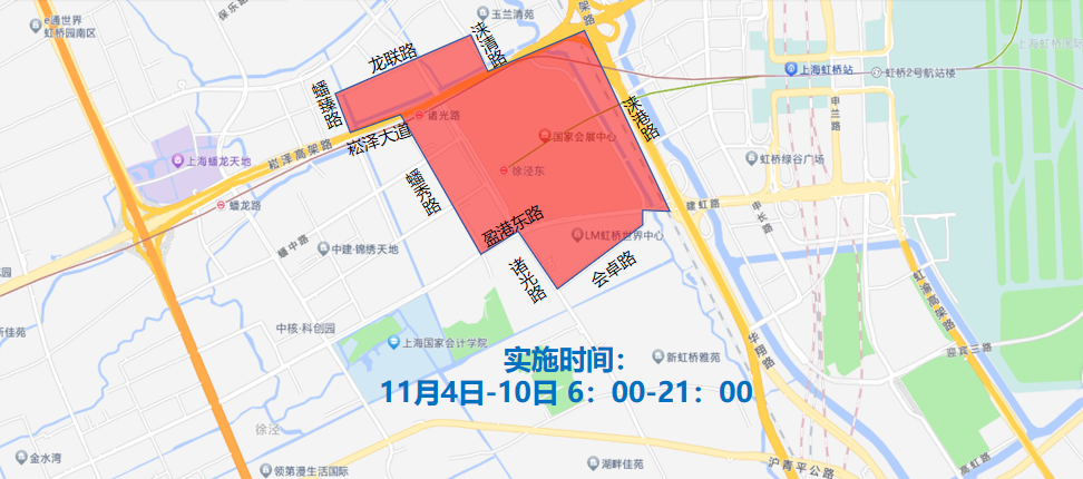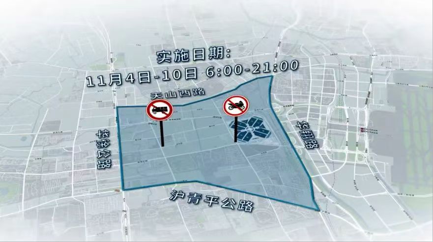 交通管制地图图示:11月4日至11月10日,每日6时至21时,沪青平公路-华徐公路-天山西路-华翔路合围区域(不含上述道路),禁止载货机动车和摩托车通行。