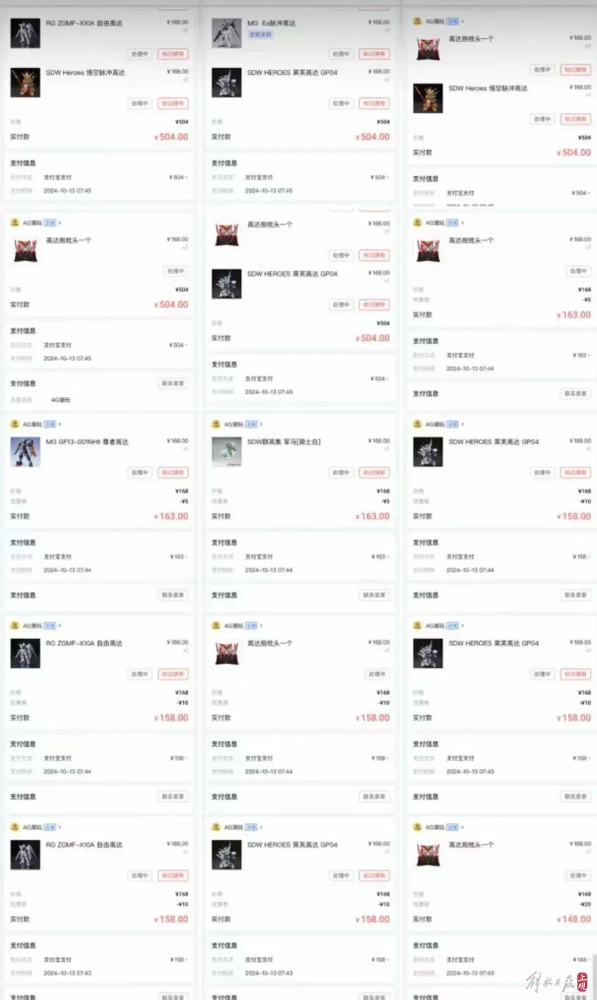 “AG潮玩”店铺已有近两千用户关注,粗略浏览,各类抽赏产品数百款,以高达为主,单抽售价超过100元的“赏”超过40款,最贵之一是199元抽一次的“马甲E”。