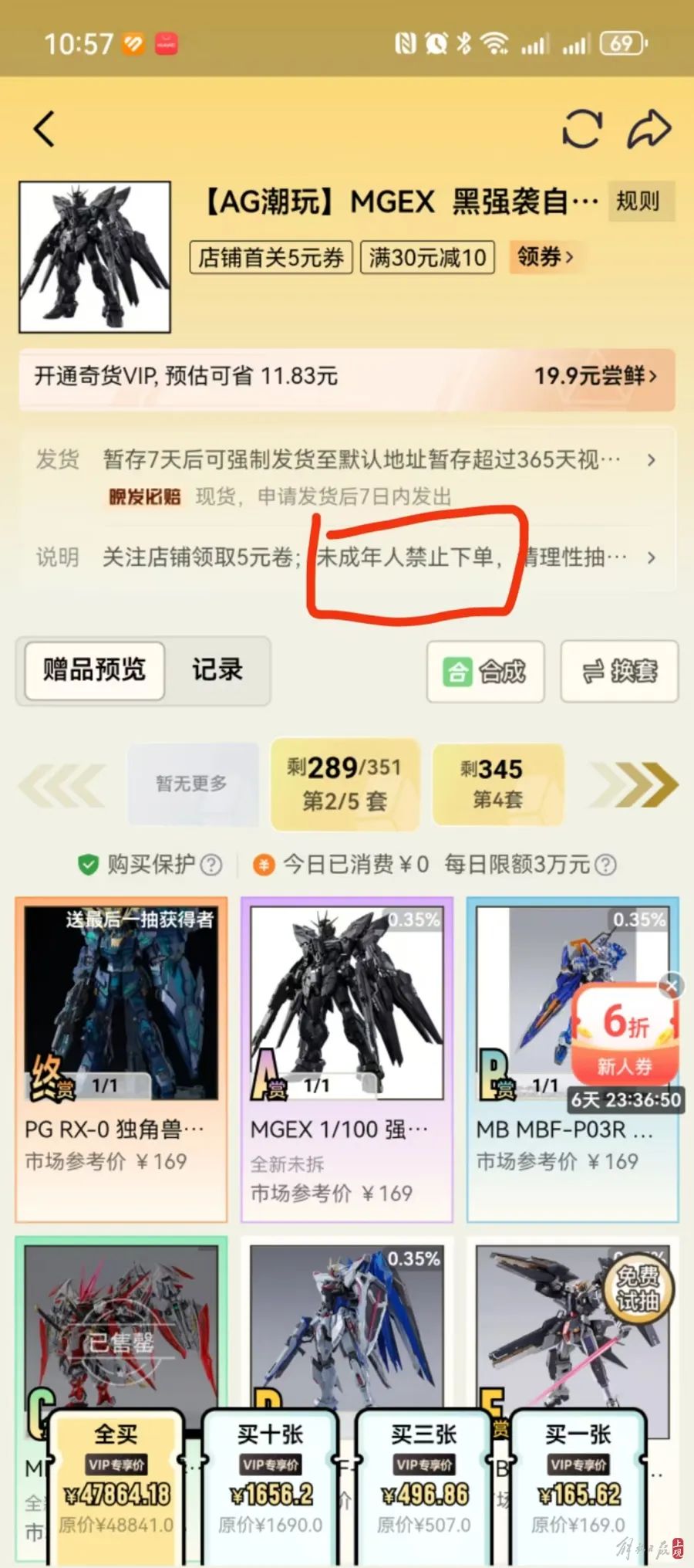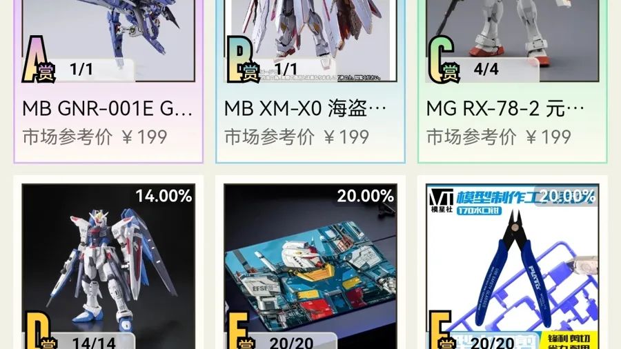 记者点击进入“马甲E”的界面,主页显示,消费金额每日限制3万元。赠品中,一共有A、B、C、D、E、F、G和H赏8种赠品,市场参考价均标199元。但实际上,赠品A赏是流通价格5000多元的“MB GNR-001E GN Arms E型”,B、C、D赏也是高达模型,流通价格分别是2000元、200元和100余元。其余赏赠品无流通价格,记者在其他平台搜索相关产品,市场价仅为几块钱至数十块钱。