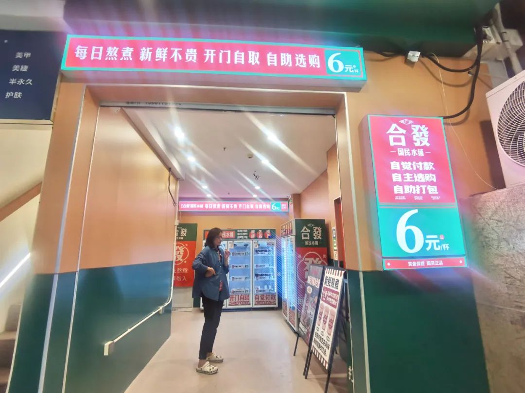 现场不少选购者是被标语吸引来的。打开柜门,取出自己需购买的饮品,然后各自扫码付款,整个流程比自动贩售机快速了不少。