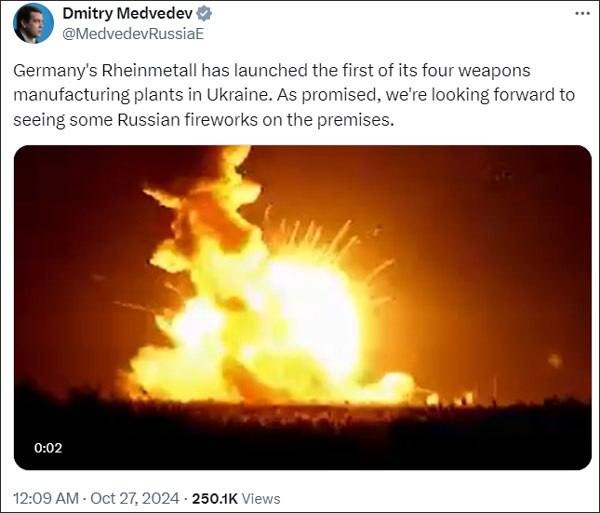 值得一提的是,莱茵金属去年宣布要在乌克兰建设军工厂时,梅德韦杰夫曾发文喊话:“坐标发一下。”