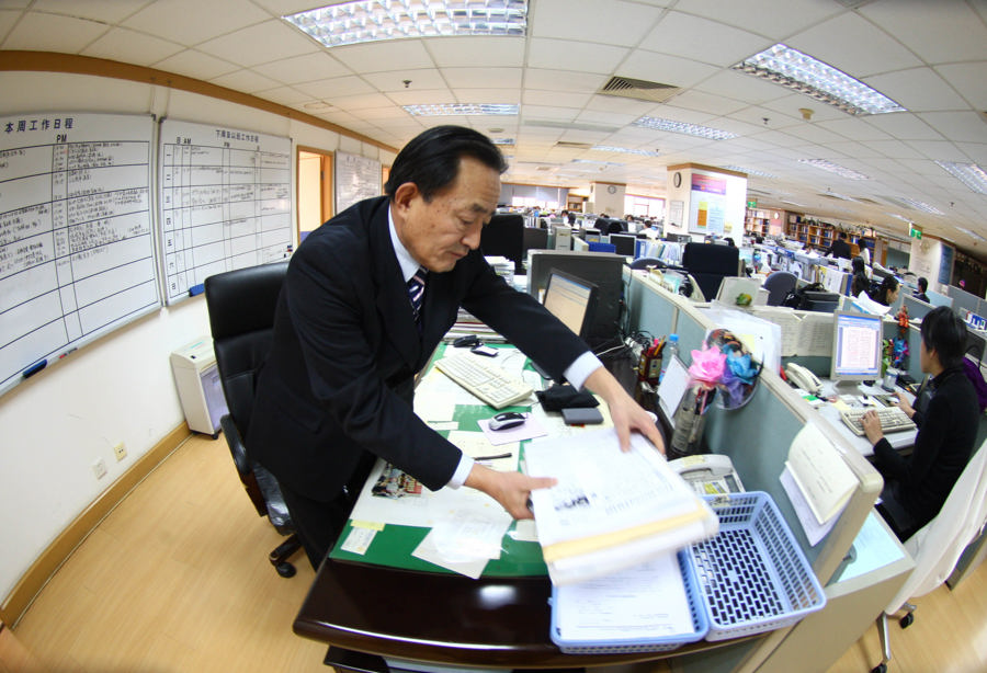 作为董事长,古林恒雄没有自己的办公室,与员工一起在大开间工作。他用的木质大写字台是24年前客户所赠,透明台板下还夹着一片淮海中路捡的落叶。