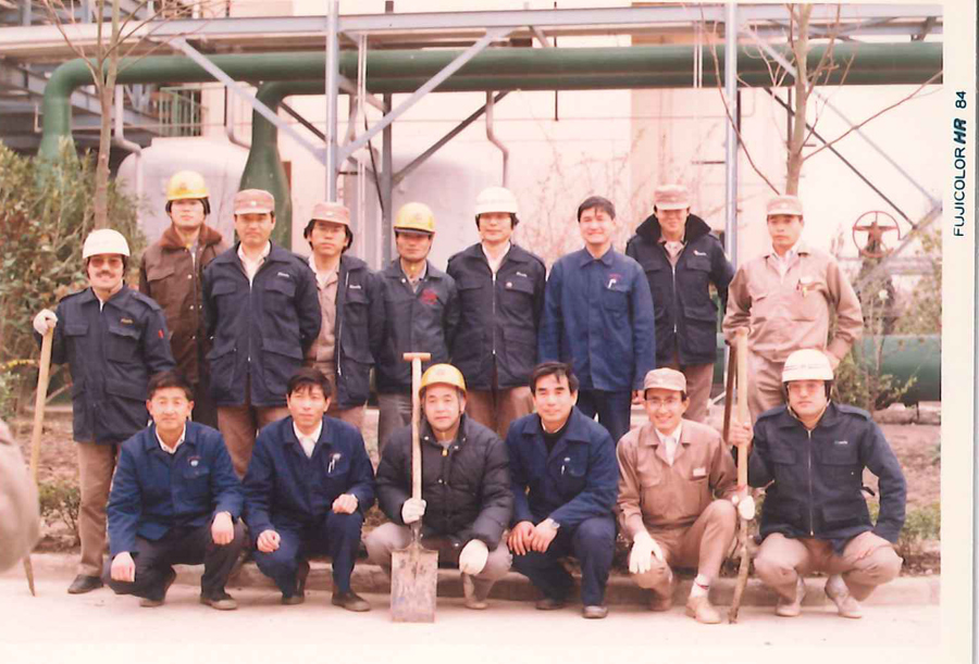 古林恒雄(前排右二)在金山石化项目中的工作照片。资料图片