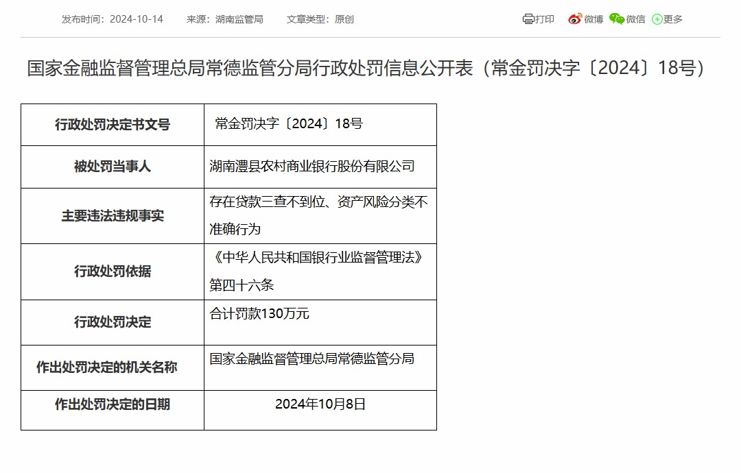 资产风险分类不准确,湖南澧县农商行被罚130万元