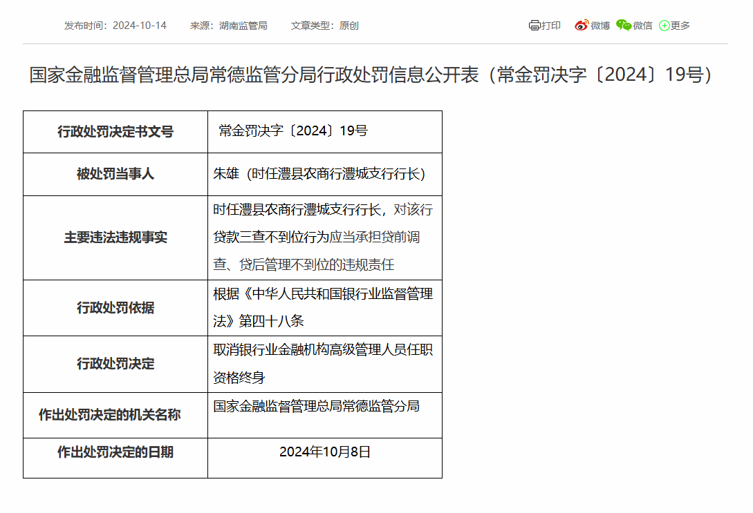 此外,朱雄(时任澧县农商行澧城支行行长),因对该行贷款三查不到位行为应当承担贷前调查、贷后管理不到位的违规责任,被取消银行业金融机构高级管理人员任职资格终身。