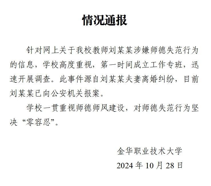 女老师被丈夫举报出轨学生?金华职业技术大学发布情况通报