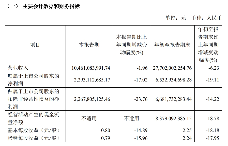 10月28日晚间,无锡药明康德新药开发股份有限公司(药明康德,603259.SH;2359.HK)发布2024年三季报,前三季度整体营业收入277.02亿元,同比下降6.23%,剔除新冠商业化项目,收入同比增长4.6%。归母净利润65.33亿元,同比下降19.11%,归母扣非净利润66.81亿元,同比下降14.22%。