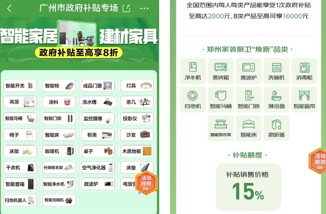 例如,京东的四川会场包含了投影仪、净水器、洗碗机、蒸烤箱、消毒柜、空气净化器等新增品类,为消费者带来更多智能生活选择;广州会场新增加了智能家居类、旧房装修和厨卫改造类、居家适老化改造类产品,进一步满足本地居民日常生活和品质升级的需求;重庆也将净水器、洗碗机等品类纳入补贴范围,助力消费者生活升级……