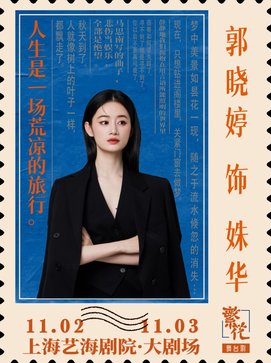 11月2日至11月3日,舞台剧《繁花》第一季亮相上海艺海剧院,连演4场,参加第23届中国上海国际艺术节。演员郭晓婷首度加盟,饰演姝华。用沪语演绎上海故事,郭晓婷说,“上海是一个有无限可能、但又足够安心踏实的地方。”
