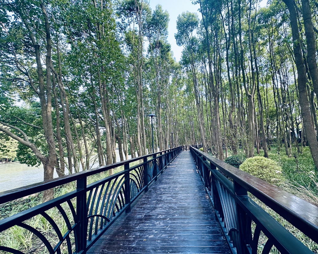 公园在八号门东侧也增设了一个新入口。根据现有地形,公园巧妙设计了约120米的木栈道,与银河桥接通直达园内。