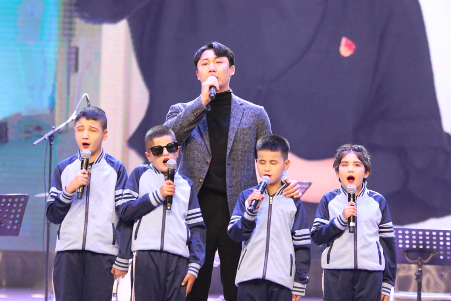 音乐会还迎来一群特殊的嘉宾,就是喀什莎车县盲人学校的孩子们。今年6月,乐团为这群特殊孩子演出,声乐演员黄晓为他们培训声乐。之后,他们的老师安章齐联系到了乐团创作中心副主任杨宏彬,希望能为盲校的孩子创作一首校歌。