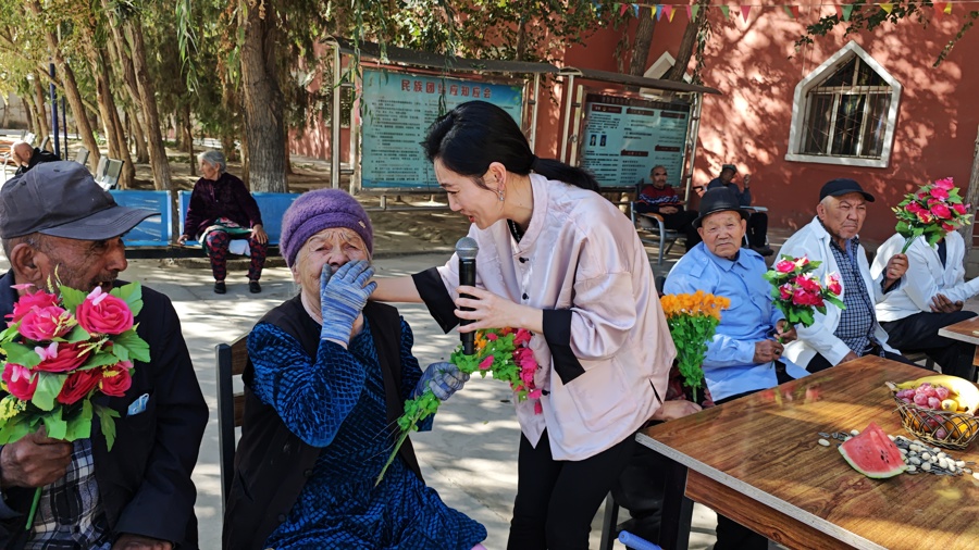 在巴楚县,乐团来到当地敬老院演出,演员们和他们手拉手,共同跳舞。一位老人说:“能看到你们精彩的演出,还能和你们手拉着手交流,我觉得特别幸福。”临别时,那些医务工作者在大巴车前与乐团挥手告别,久久不愿离去。