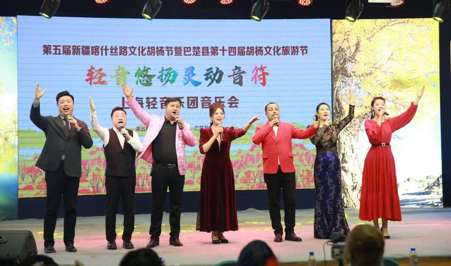 秋天正是喀什的胡杨林最美的季节。第五届新疆喀什丝路文化胡杨节暨巴楚县第十四届胡杨文化旅游节开幕式的现场,乐团声乐演员陈泽鑫和李霖菲儿唱响了乐团原创歌曲《三千年之恋》。