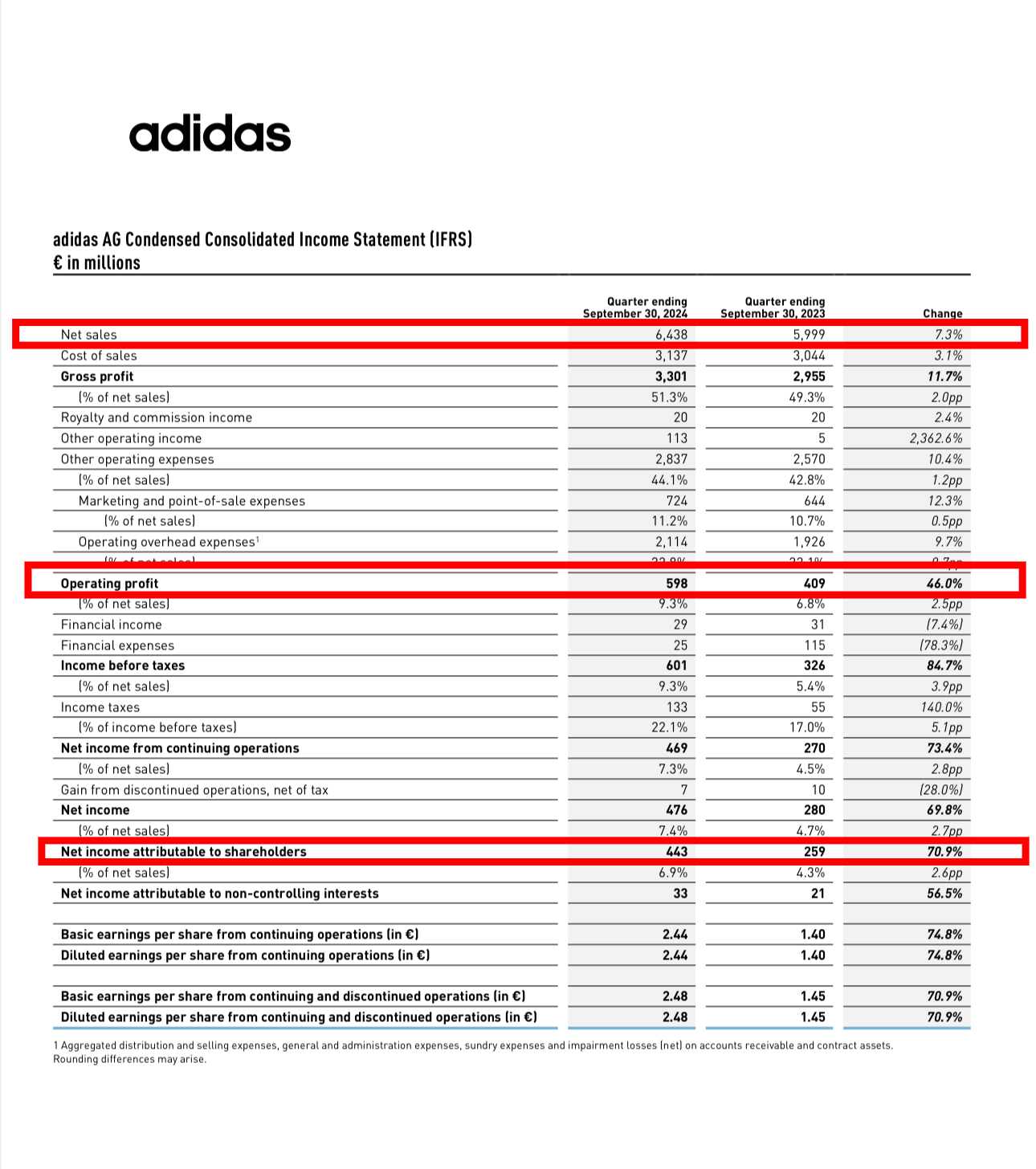 基于第三季度业绩好于预期及品牌发展势头强劲,阿迪达斯于10月15日上调全年业绩指引。阿迪达斯预计,在货币中性下2024年营收增长率将达到10%,此前预计以高个位数的速度增长;营业利润将达到约12亿欧元,此前预计约10亿欧元。