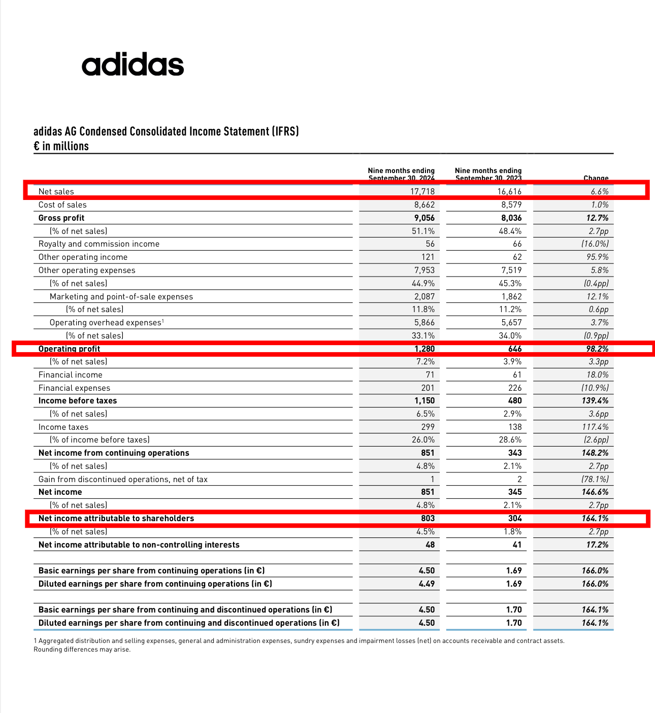 整体来看,今年前三季度阿迪达斯全球实现营收177.18亿欧元,同比增长6.6%;归母净利润为8.03亿欧元,同比增长164.1%。