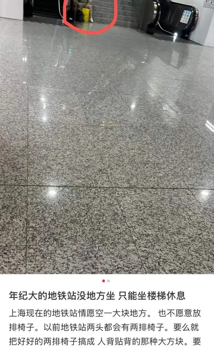 “年纪大的地铁站没地方坐,只能坐楼梯休息。”近日,有市民在社交平台发了一张老人坐在抚顺路地铁站阶梯上休息的照片,并吐槽上海地铁站内的公共座椅难寻。