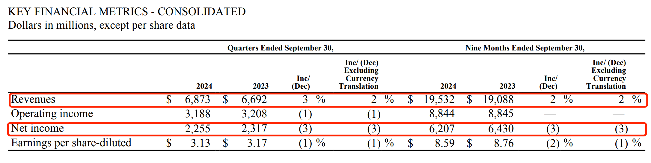 当地时间10月29日,连锁快餐巨头麦当劳(MCD:US)公布了截至2024年9月30日的第三季度业绩。麦当劳实现营业收入近68.73亿美元,不考虑汇率影响同比增长2%,高于市场预期;实现净利润22.55亿美元,不考虑汇率影响同比下滑3%;第三季度调整后每股收益3.13美元,不考虑汇率影响同比下滑1%。