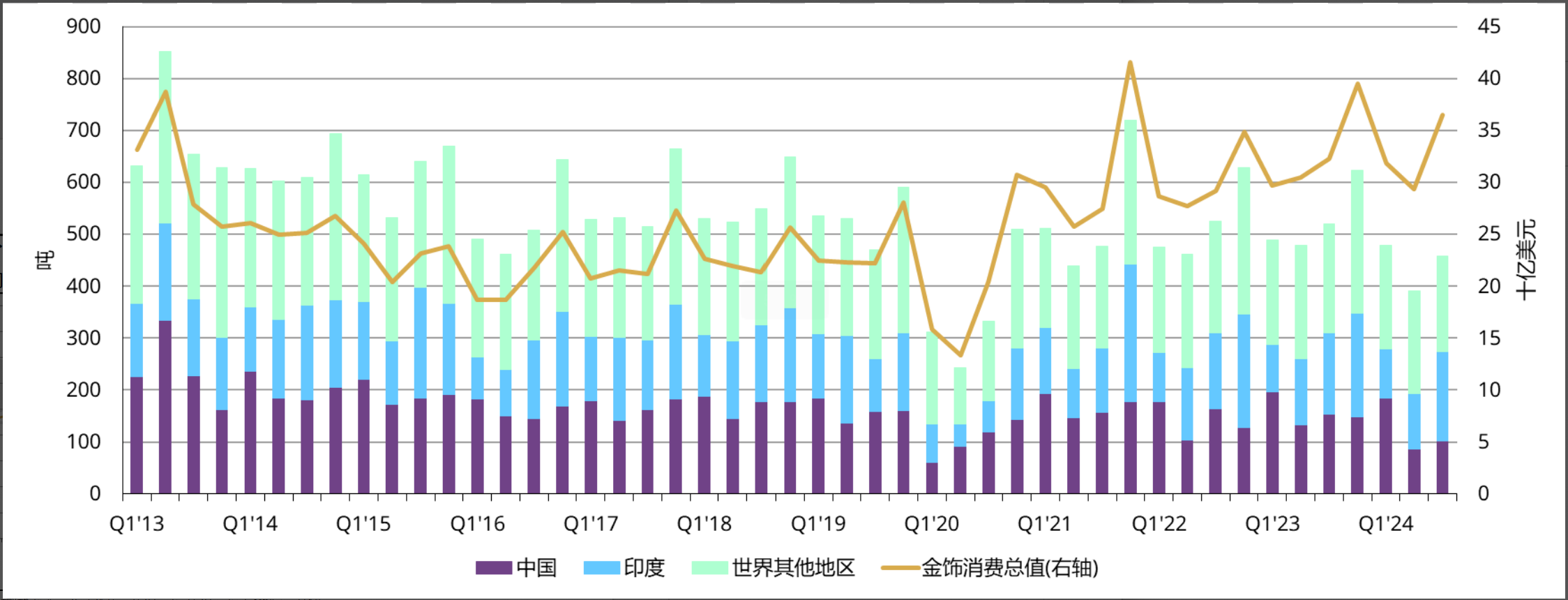 本季度金价屡创新高,均价达2474美元/盎司,抑制了全球金饰需求的增长。《报告》数据显示,金饰消费总量同比下降12%至459吨,但其价值总额同比上升13%达360多亿美元,反映出消费者更愿意花费金钱去购买轻量化的金饰产品。