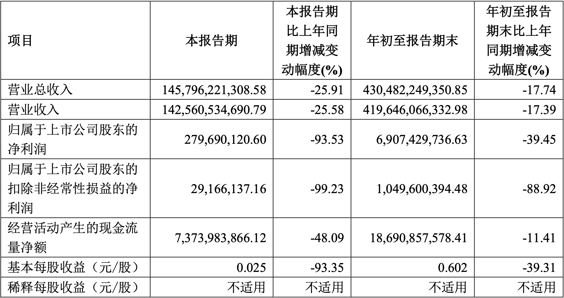 10月30日,上海汽车集团股份有限公司(上汽集团,600104)披露三季报,第三季度实现营业总收入1457.96亿元,同比下降25.91%;归属于上市公司股东的净利润2.8亿元,同比下降93.53%;基本每股收益0.025元。