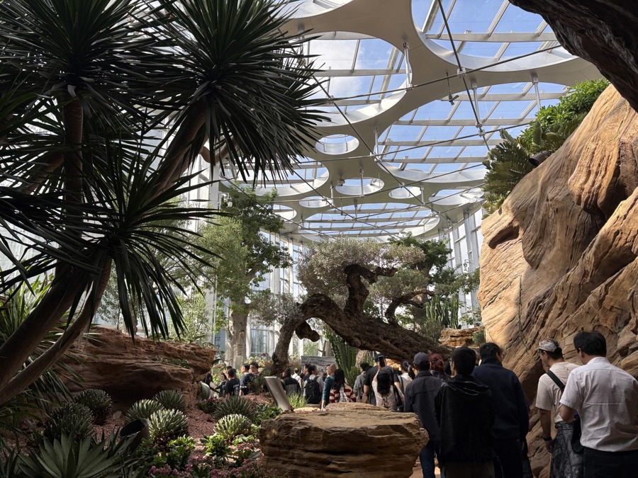 在上海温室花园1号馆海市沙洲,记者遇到了家住张江的田阿姨。听说场馆火爆,田阿姨特地让女儿帮忙在网上提前购票预约,让她和小姐妹一睹温室真容。由海市沙洲、云上森林和云雾峡谷三大主题场馆组成的温室花园,择取世界生态系统中的典型生态片段,分别展示热带干旱植物、热带雨林植物与热带花卉植物。精心打造的环境类型,加上艺术装置、投影、环幕的设置,得到了各年龄段游客的一致好评。
