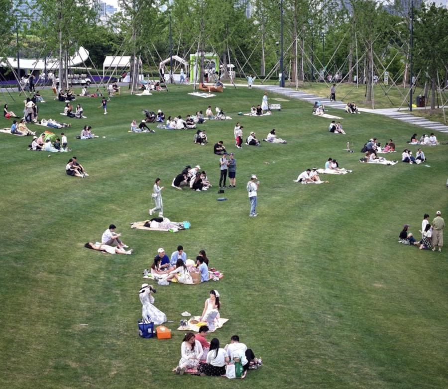 2021年12月31日,上海世博文化公园北区率先开放。具有江南园林文化特色的园中园——申园,现已接待近60万名游客。环境宜人、视野开阔的音乐之林大草坪,被人们亲切地称为“上海的阿勒泰”。每逢假期,草坪上都“长”满了人,野餐、玩飞盘、打滚、放空……各有各的玩法。
