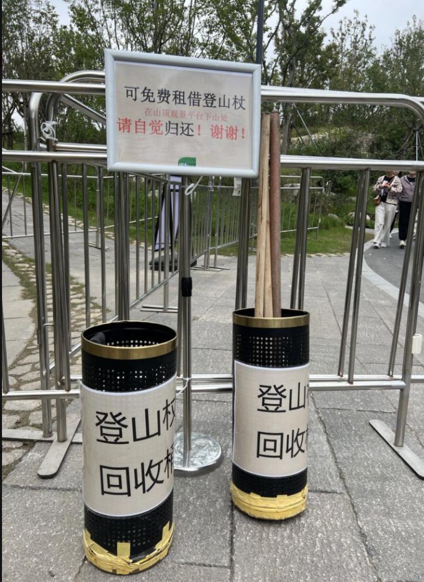 在社交网络上引起热议的登山杖租借服务,也是园方特意为之。爬上海拔48米的顶峰,对户外爱好者来说只是小菜一碟,但对腿脚不便的老年人来说,也是一定程度的挑战。尤其碰上下雨天,台阶湿滑,有一根登山杖助力,爬山的安全性也能增加。