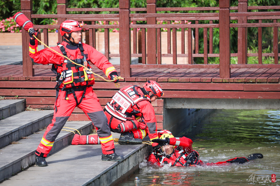 亲水平台岸际综合救援,通过活饵、抛绳、伸缩杆和抛投器救援技术,模拟岸际出现人员落水的突发险情。