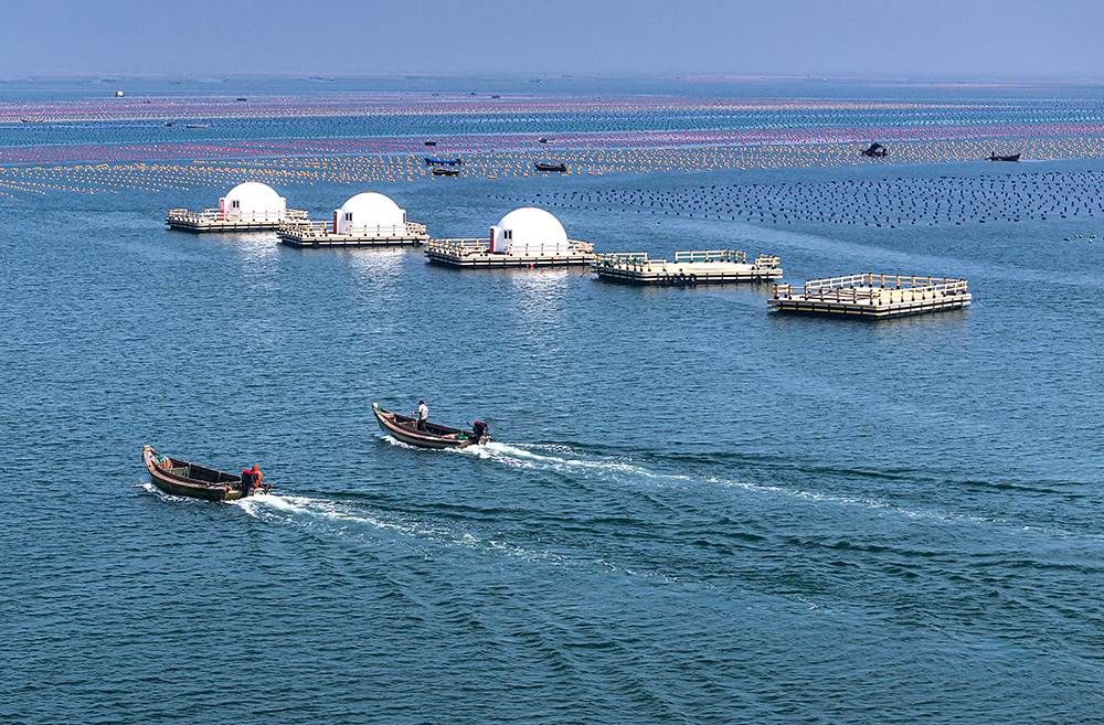 8月16日,在山东省荣成市俚岛镇俚岛湾海域生态养殖区,渔民驾驶渔船出海作业(无人机照片)。新华社 资料图