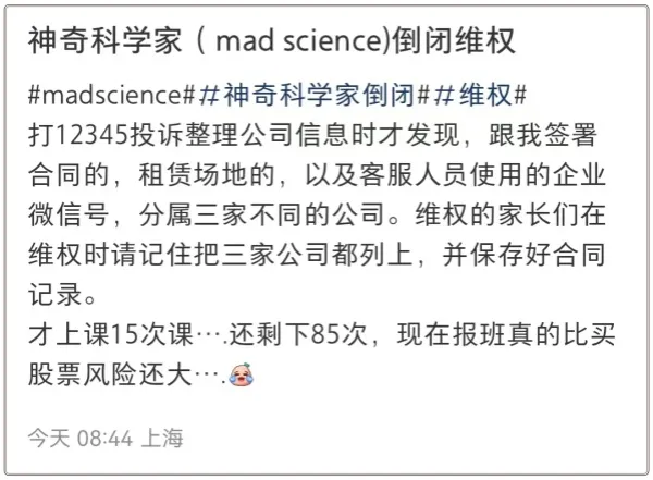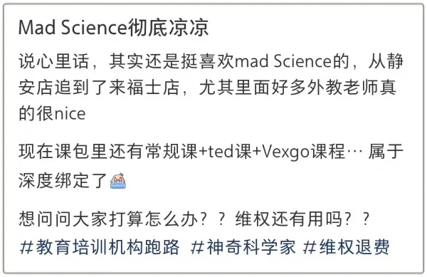 昨夜今晨起,社交媒体上开始出现不少针对“Mad Science”闭店的吐槽帖。家长们的心里,都是苦水。“现在课包里还有常规课+ted课+vexgo课程……属于深度绑定了。”“我还剩82课时。”“昨天还在接收消息,今天就倒闭了。”