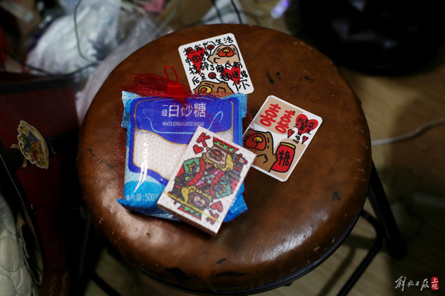 一包白砂糖,54张香蕉自己设计的扑克,一页祝福卡,构成了喜糖,上面写着:把我们生活中的甜揉碎了磨成粉后全都送给你。