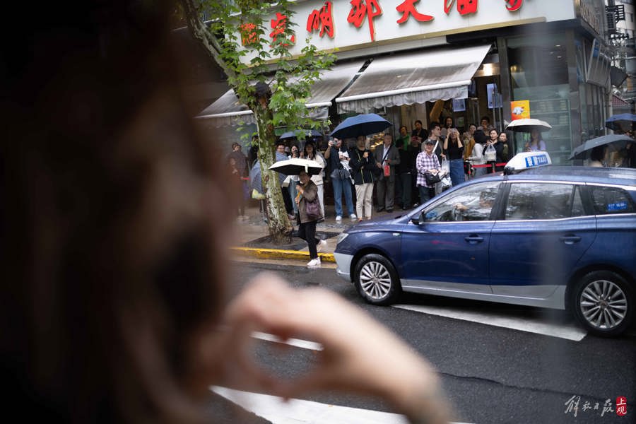 然后很多人走过来,新人给他们送上喜糖和气球。车到淮海路,有老外给他们比心;王香蕉和伴娘探头与路人说话时,站在车边的警察礼貌地往后让了让;还有不认识的车主,摇下车窗祝他们新婚快乐!