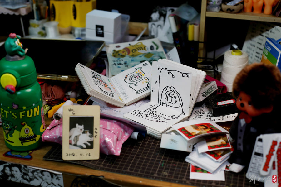 工作室的桌子很乱,但一眼就能看到“皮蛋”和“咸蛋”,以及在随身携带的手绘本上记录的“灵感”。