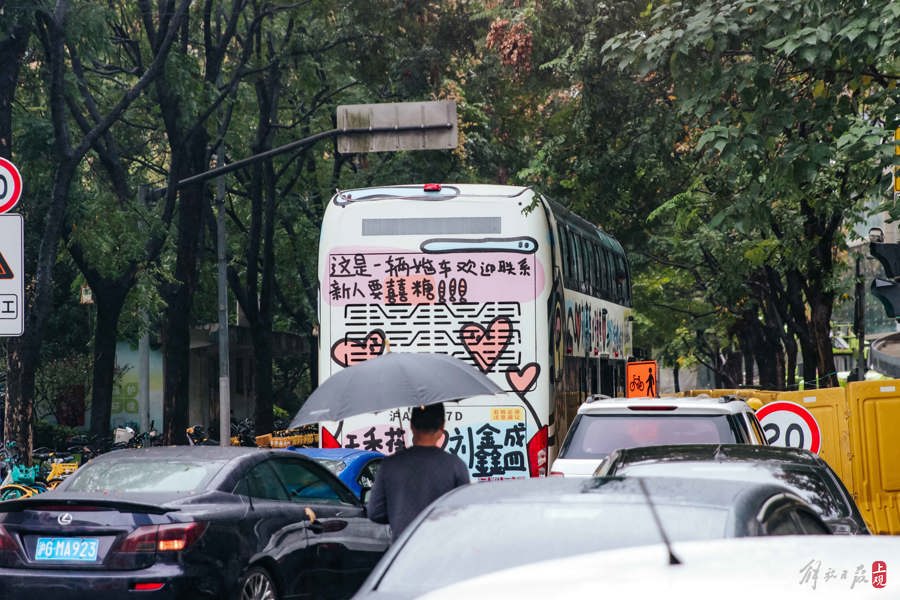 巴士背后写着:这是一辆婚车,欢迎联系新人要喜糖!