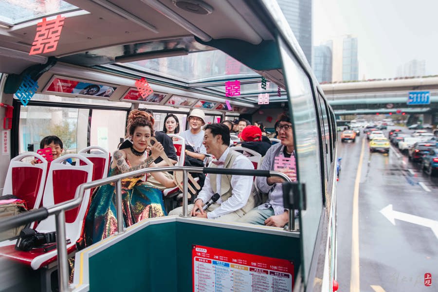 视频里一辆行驶到常熟路、五原路路口,涂装婚礼喜庆氛围的双层巴士遇红灯停下,一个姑娘走上前问,是真的结婚了吗?新郎大声回答“是”。