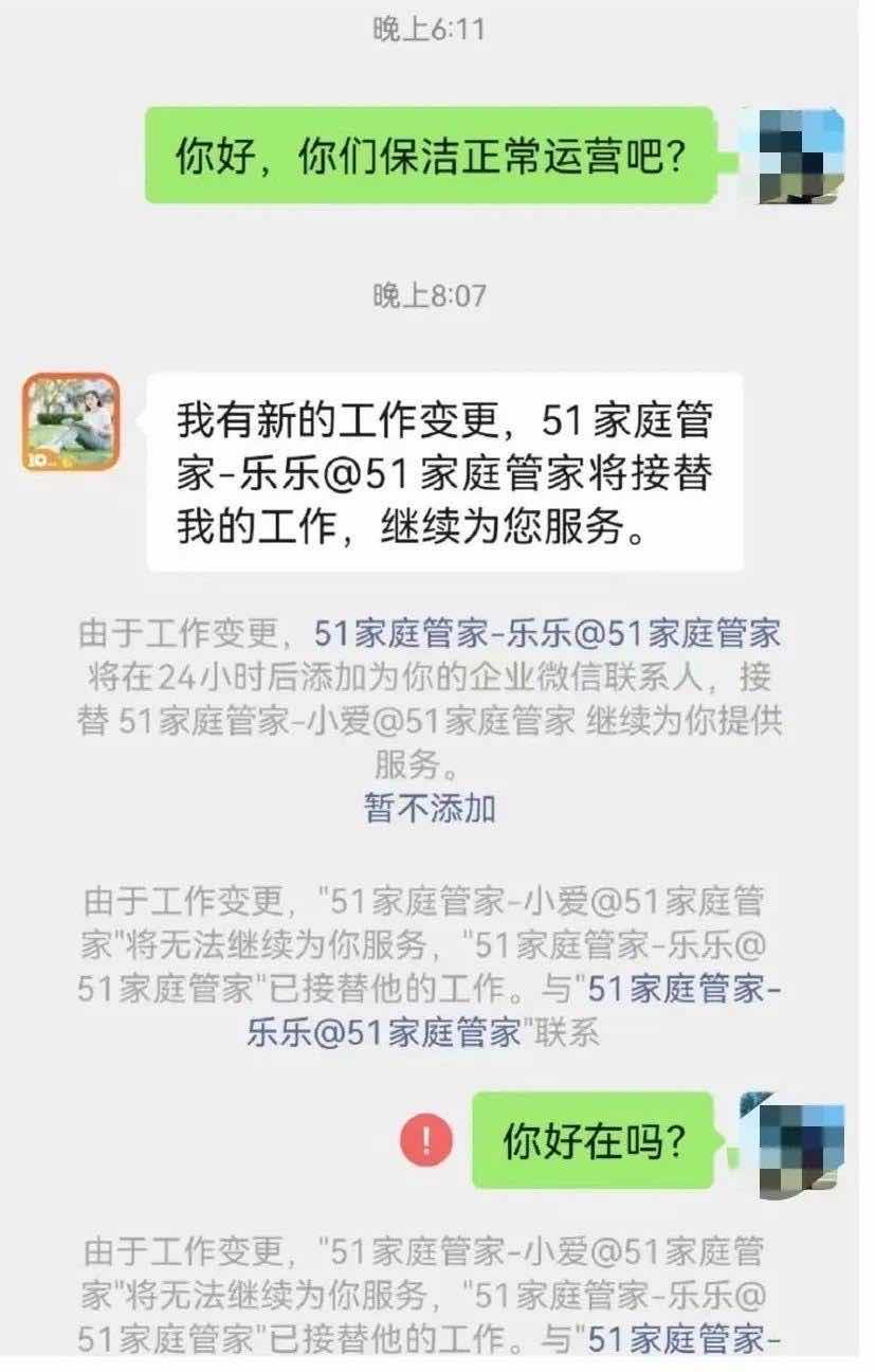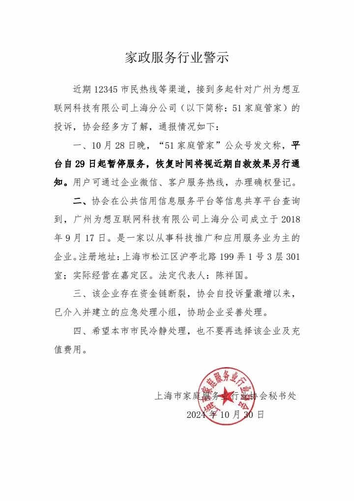 10月31日,“上海市家庭服务业行业协会”微信公众号发文称,近期,12345市民热线等渠道接到多起针对广州为想互联网科技有限公司上海分公司(51家庭管家运营方)的投诉。该企业存在资金链断裂,协会已介入并建立应急处理小组,协助企业妥善处理。希望市民不要再选择该企业及充值费用。