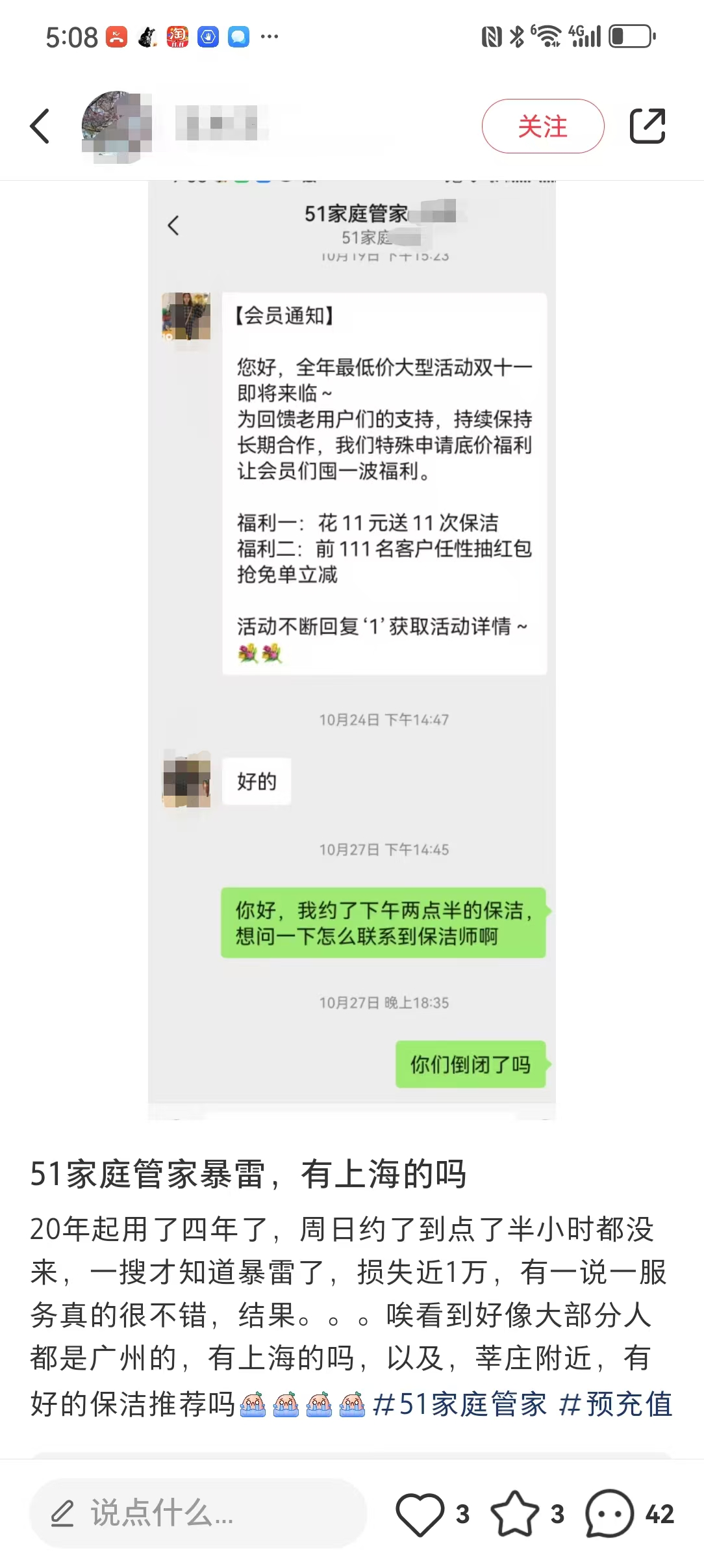 近日,有网友在社交平台反映,“51家庭管家”家政平台爆雷,“约了搞卫生,结果人没来,电话打不通,发消息全部未读”。还有网友发帖称,自己在这个家政平台上充了不少钱,现在想退款却找不到渠道。网友分享的聊天记录显示,10月19日客服还在推销“双十一”活动。