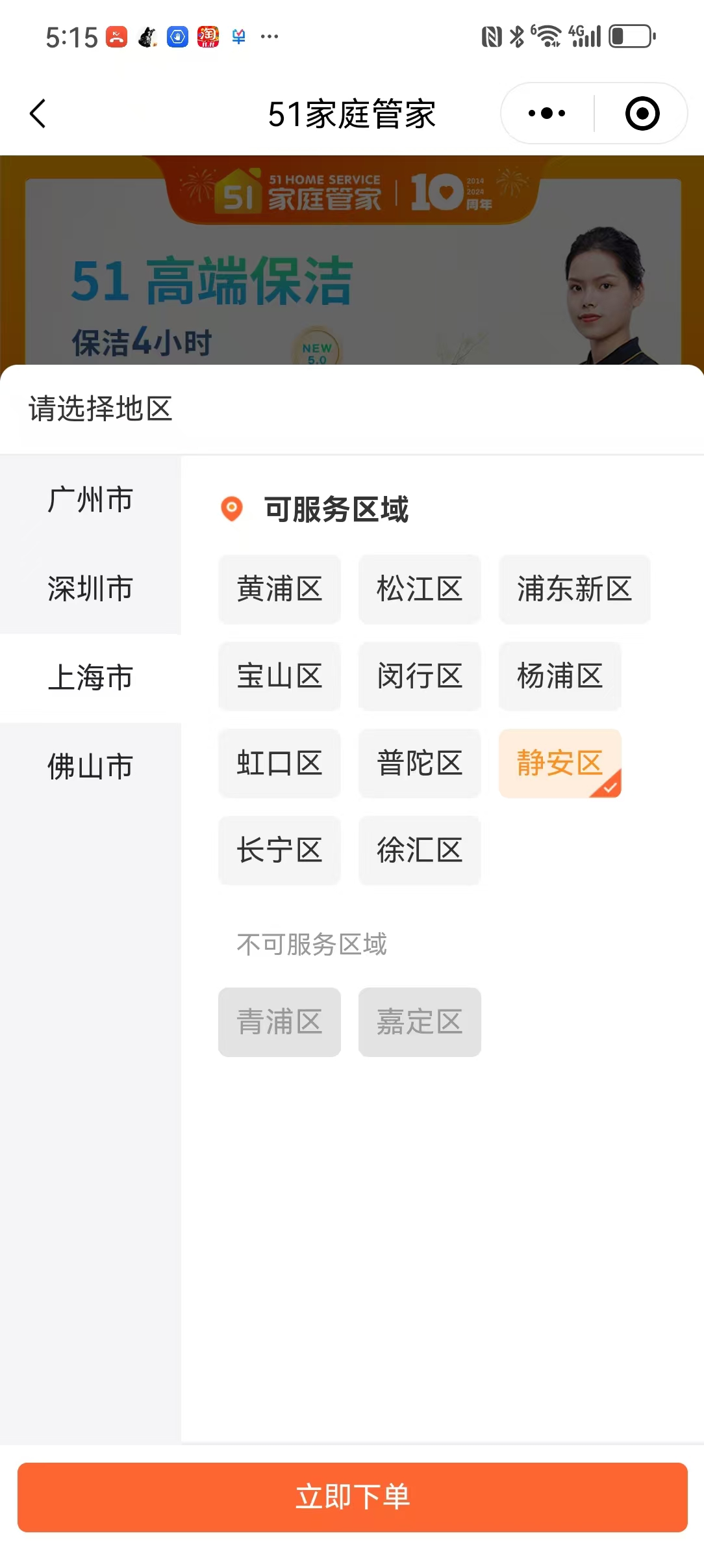 当天,澎湃新闻记者“51家庭管家”小程序尝试预约保洁服务,选择上海市静安区、黄浦区、松江区等多区后,显示支付失败,服务已无法预约。