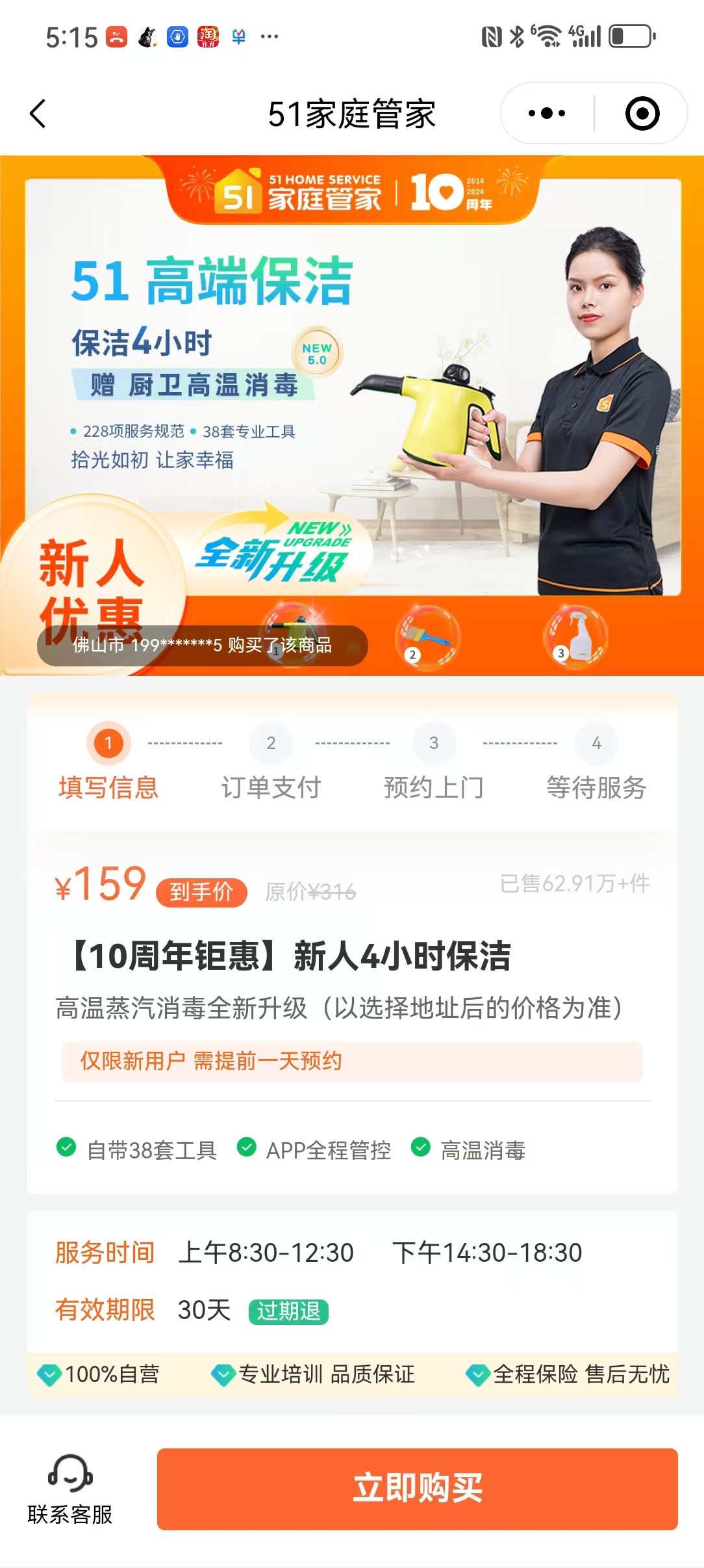 10月31日,“51家庭管家”小程序中保洁服务支付失败,无法预约。 小程序截图