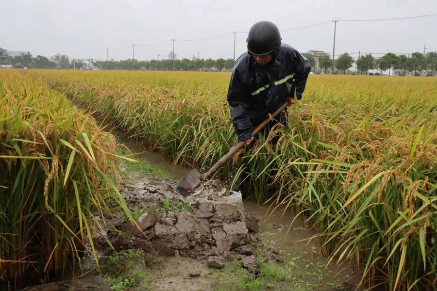 在朱泾镇慧农村千亩稻田,目前已经到了晚稻的成熟期,经过一夜暴雨洗礼,部分稻田区域积水明显。沟渠旁,农户正进行着及时的清理疏通,“在台风来之前,我们已经对稻田开展了一次全面排查,开展了清淤开渠等工作,降雨期间,我们包括村干部都会对低洼易积水区域巡查,实时根据积水情况,进行个别点位疏通,昨夜开始村里已经开了多台排水泵,基本避免了大面积积水”。