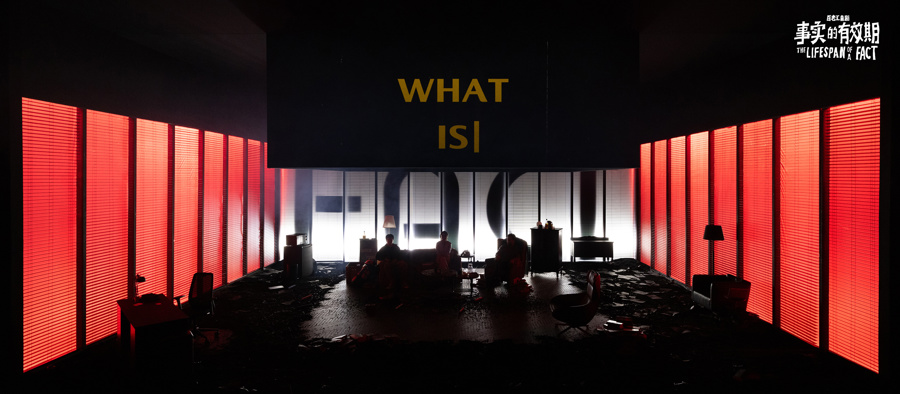 在舞美设计师沈力看来,新闻真实性在当代生活中是充满争议的话题,“人们在意的是什么?到底是真正的事实,还是‘我想听到的真实’?看似喜剧般的对白台词,字字句句发人深省。”《事实的有效期》采用以黑色为主基调的舞台呈现,随着剧情随时变换为办公室、家,营造出多元的表演空间。舞台中心区域的家具陈设保持现实的生活感,周围百叶窗包围的空间被黑色吞噬。