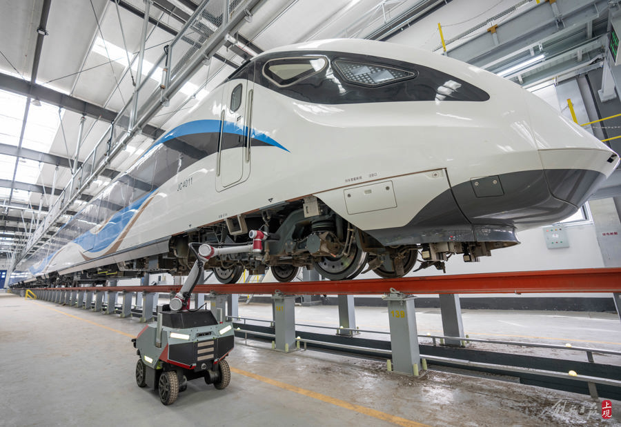 机场联络线申昆路临时检修基地内, 检修机器人正在作业。