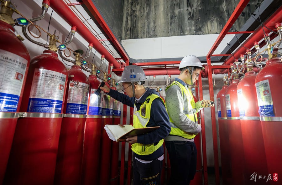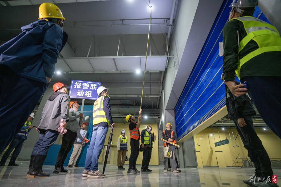 在景洪路站内, 工作人员正在测试消防报警装置。