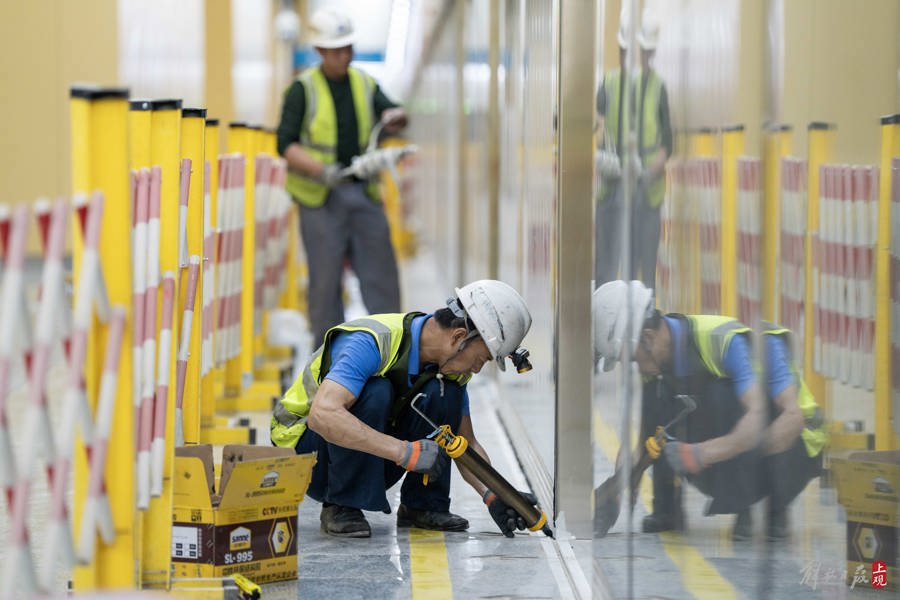 工作人员对景洪路站站台屏蔽门进行收边工作。