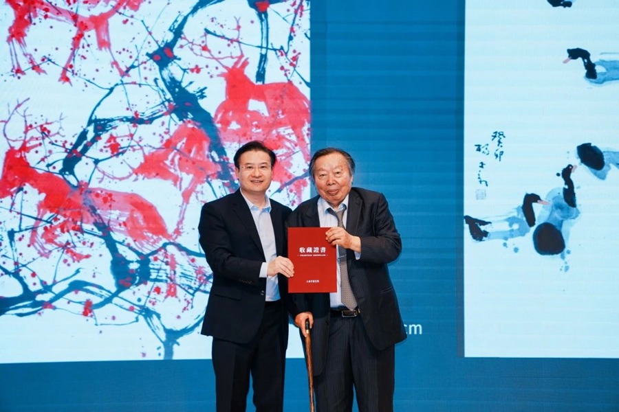 开幕式上,杨正新向上海中国画院捐赠了作品《中华麋鹿》《悠然》。上海中国画院党总支书记、主持工作副院长江鹏向杨正新颁发收藏证书。