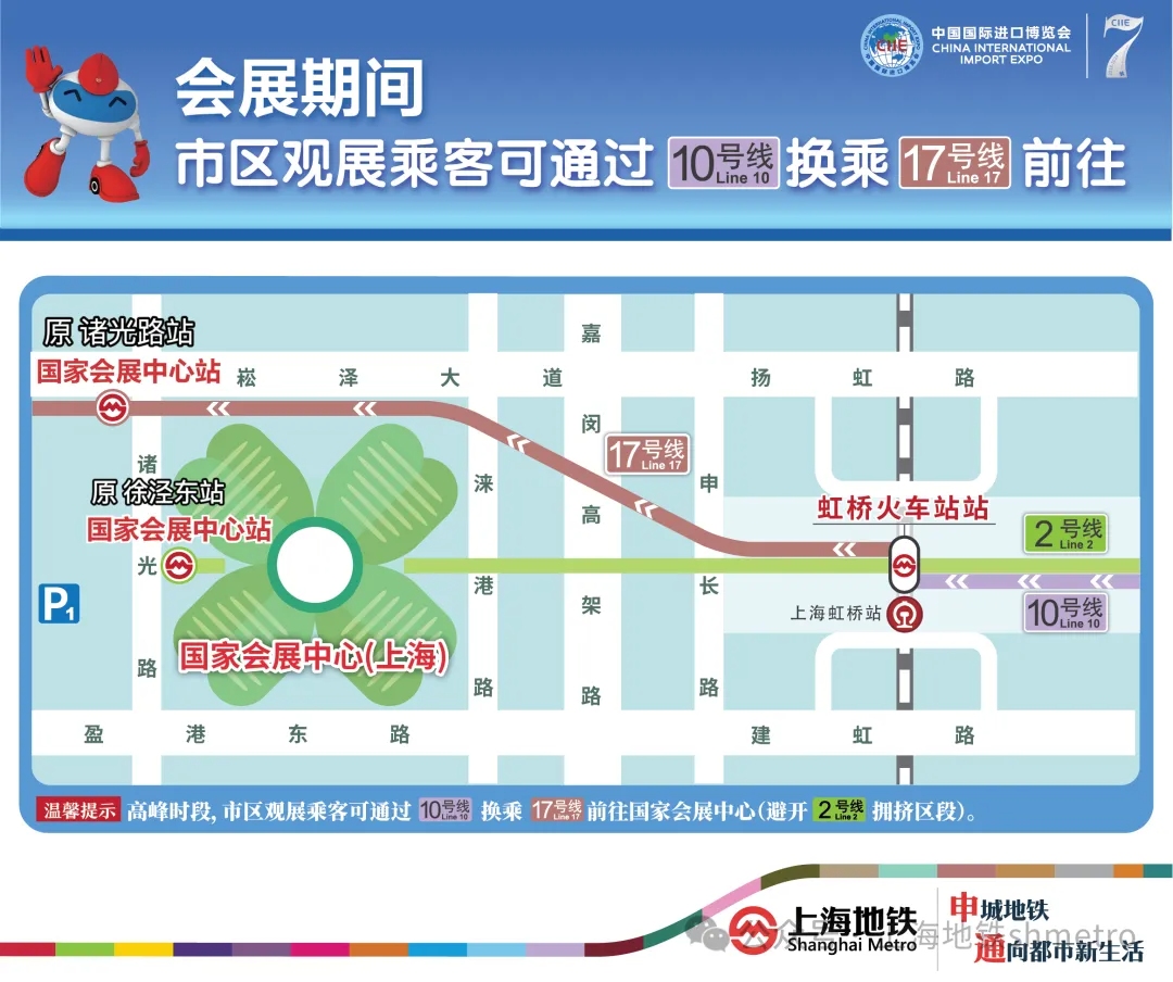 展会期间,由于2号线客流压力较大,建议观展乘客乘坐10号线至虹桥火车站站,再换乘17号线至17号线国家会展中心站前往国家会展中心,从而避开2号线大客流区段。散场时,建议观展乘客在17号线国家会展中心站进站,乘坐1站至虹桥火车站站后,再换乘10号线前往市中心及换乘其他线路。
